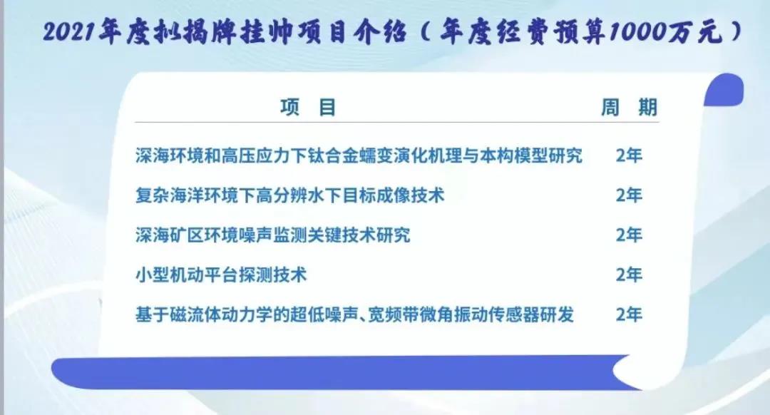 圍繞深海領(lǐng)域基礎(chǔ)性、前沿性關(guān)鍵核心技術(shù),太湖實(shí)驗(yàn)室發(fā)布了2021年 “揭榜掛帥”項(xiàng)目,對(duì)外發(fā)出“求賢令”、“英雄帖”,希望通過“揭榜掛帥”項(xiàng)目發(fā)布,為人才引進(jìn)“投石問路”,為創(chuàng)新潛能“提質(zhì)增速”。