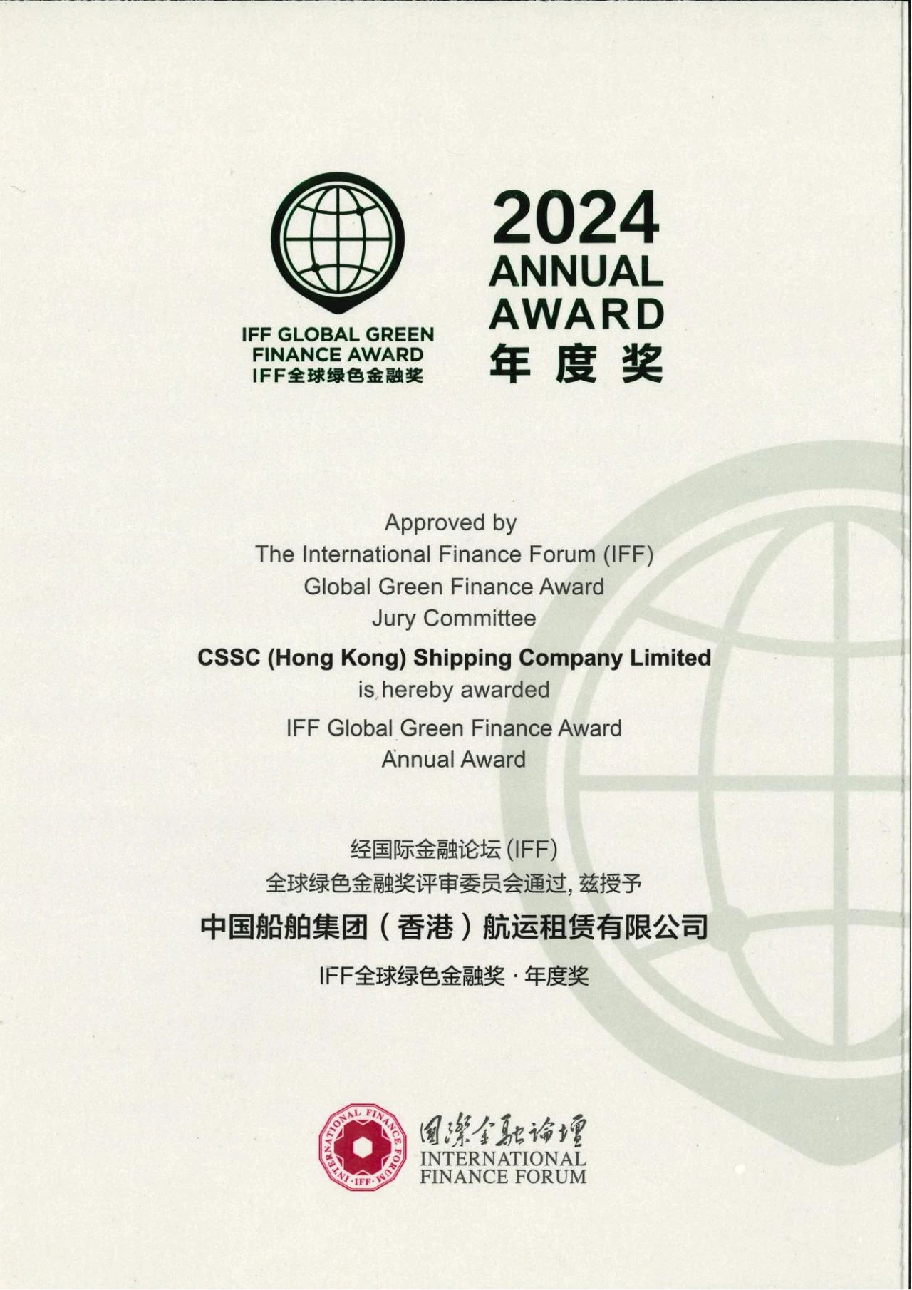 日前,在中國香港舉行的國際金融論壇(IFF)第21屆全球年會(F20峰會)上,發(fā)布了第五屆“IFF全球綠色金融獎”評選結(jié)果。中國船舶集團(tuán)中船租賃憑借其在綠色金融領(lǐng)域綜合實(shí)踐的杰出表現(xiàn),首度榮膺“IFF全球綠色金融獎——年度獎”。這是繼2021年獲得“IFF全球綠色金融創(chuàng)新獎”,中船租賃再上一層樓,榮獲年度大獎。