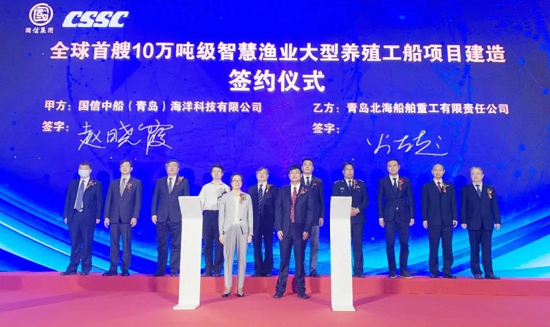 ????6月3日,中國船舶集團(tuán)有限公司旗下武船集團(tuán)青島北海船舶重工有限責(zé)任公司與國信中船(青島)海洋科技有限公司在青島西海新區(qū)正式簽署全球首艘10萬噸級智慧漁業(yè)大型養(yǎng)殖工船的建造合同。本次簽約標(biāo)志著養(yǎng)殖工船項(xiàng)目正式進(jìn)入實(shí)質(zhì)性建造階段,該船將于2022年3月交付。中國船舶集團(tuán)黨組成員、副總經(jīng)理孫偉,青島市副市長耿濤等領(lǐng)導(dǎo)和嘉賓出席簽約儀式。
