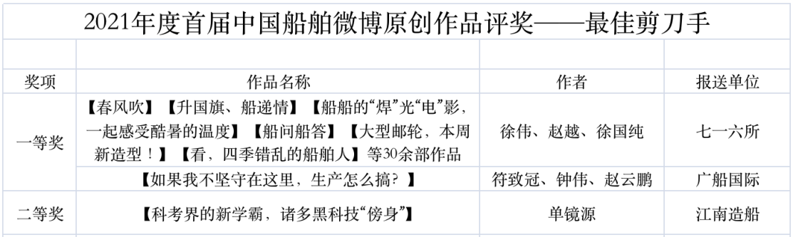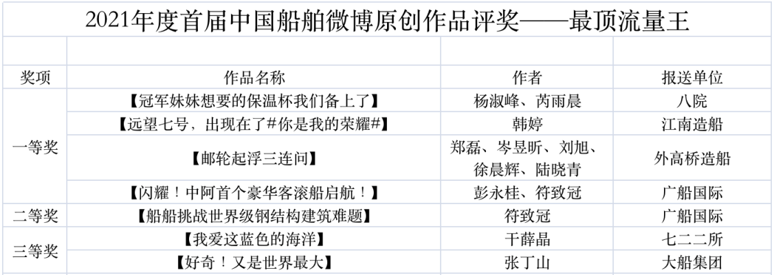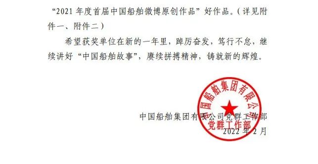 為鼓勵更多成員單位積極加入到中國船舶集團新媒體平臺的宣傳中來,在集團公司黨群工作部的指導下,中國船舶報社從不同維度,對2021年度各單位支持“中國船舶”微信的力度進行了梳理統(tǒng)計,并利用微博政務的全國專家?guī)煸u審資源,對2021年度“中國船舶”微博原創(chuàng)作品進行了專業(yè)評審,評選結(jié)果公布如下: