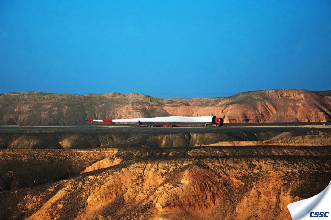 虎年開(kāi)年, 中國(guó)海裝首臺(tái)H155-5MW機(jī)組在百里風(fēng)區(qū)——新疆哈密成功完成吊裝,該機(jī)組是新疆哈密目前單機(jī)容量最大的風(fēng)電機(jī)組。圖為超大型風(fēng)葉運(yùn)輸過(guò)程的縮影。