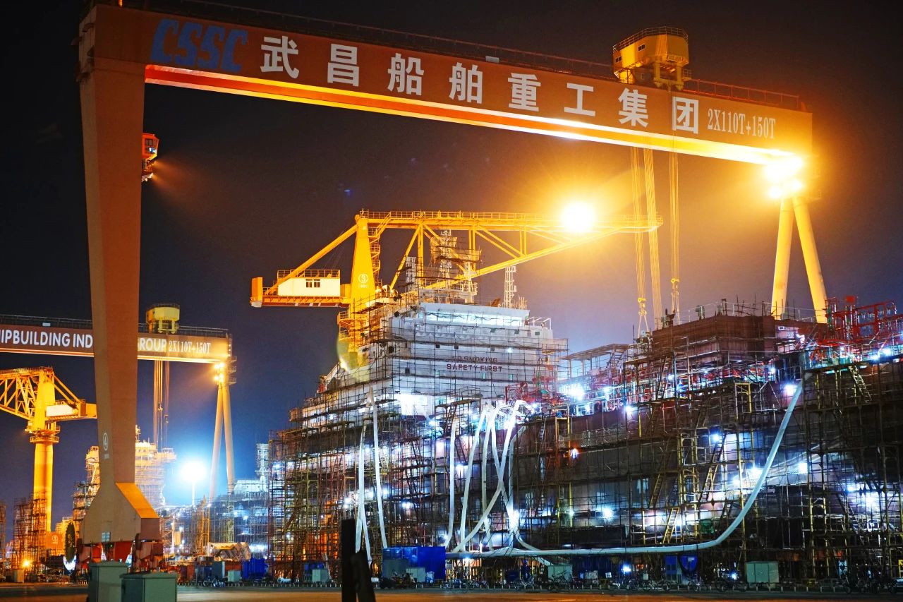 在武漢船機平臺總裝現(xiàn)場,華夏金租神大平臺配套的1200噸起重機正在安裝,大件吊裝各項準備工作繁瑣,一切就緒時,天已經(jīng)黑了,現(xiàn)場一鼓作氣開始吊裝對接,展現(xiàn)了船舶人只爭朝夕、不負韶華、忘我工作精神風貌。