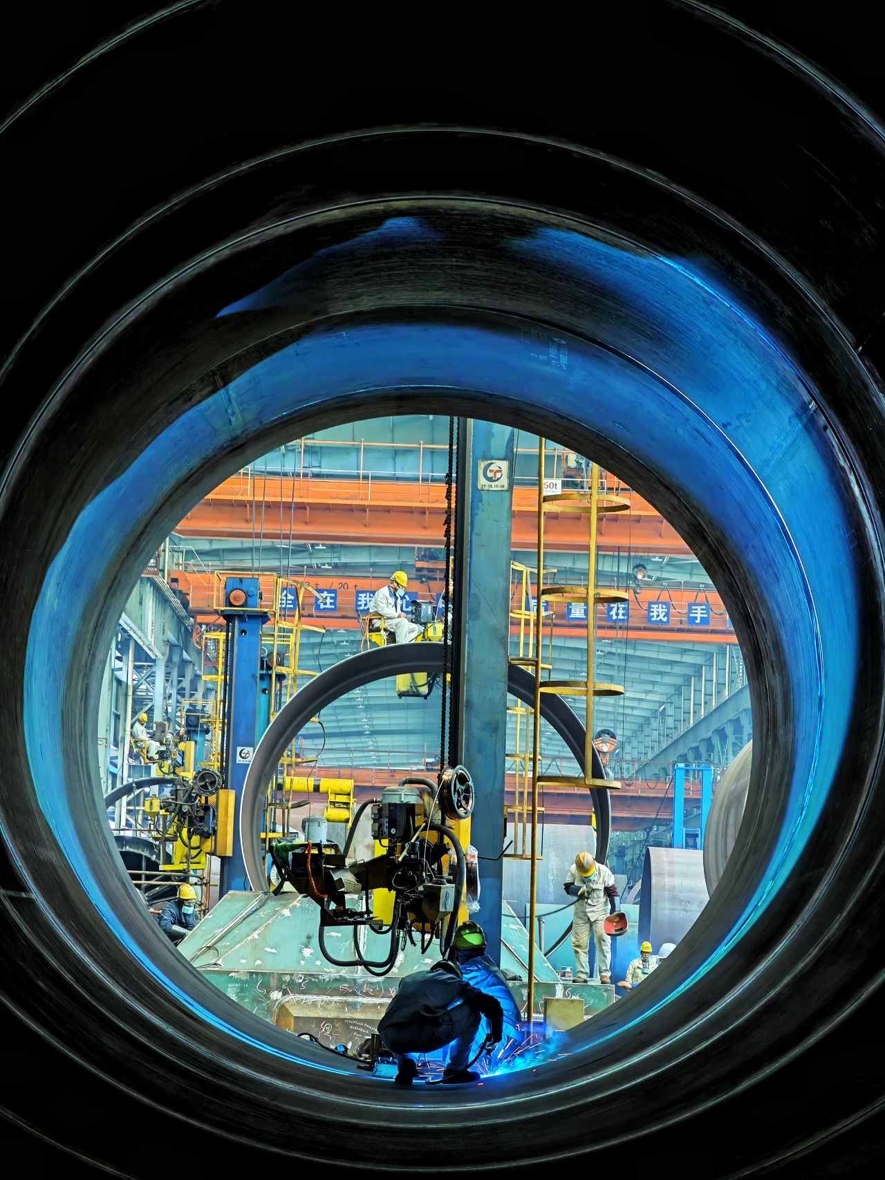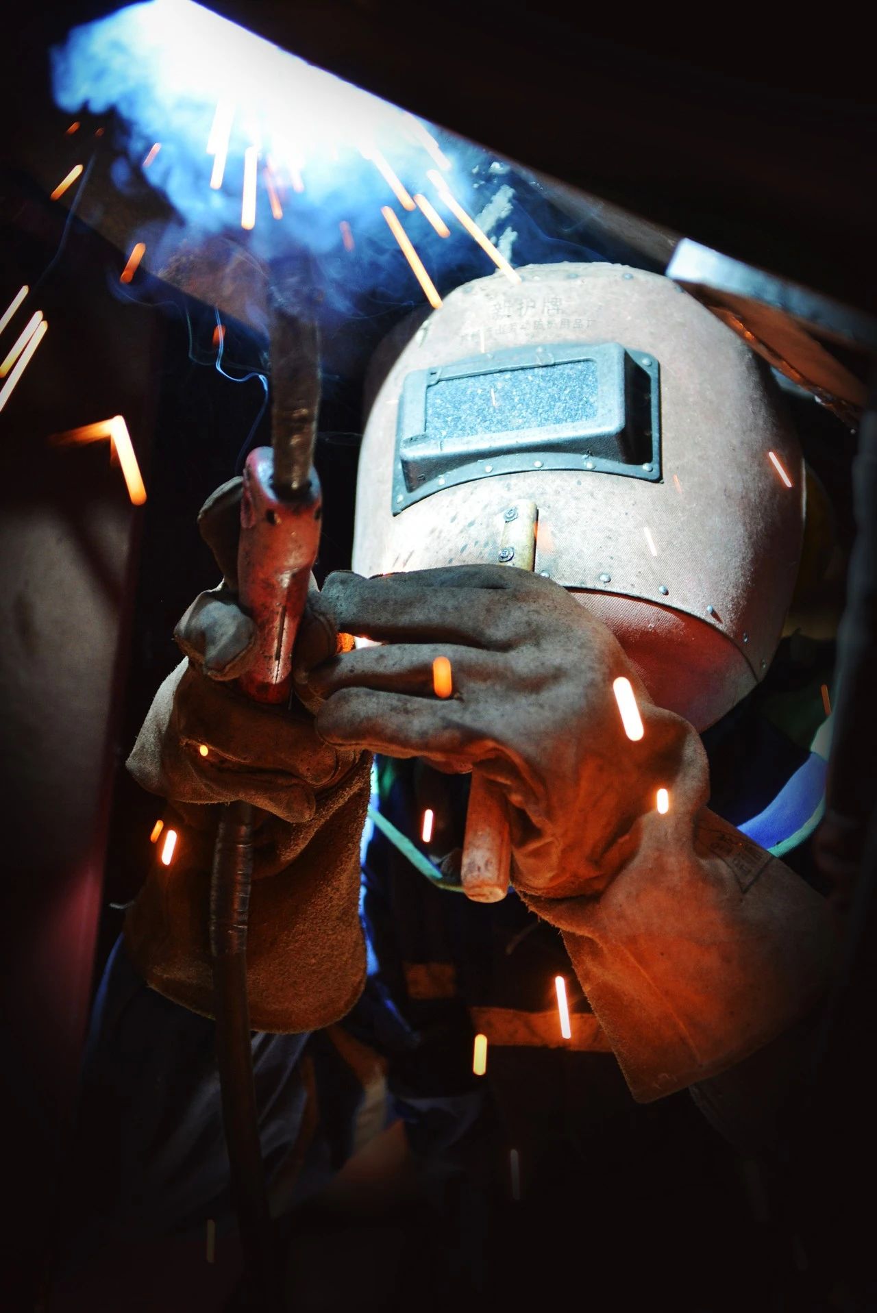一位“全副武裝”正在進(jìn)行焊接作業(yè)的焊工,焊花飛舞在狹小的工間里,折射出如彩云般的景象,猶如巨人正在“補(bǔ)天”。