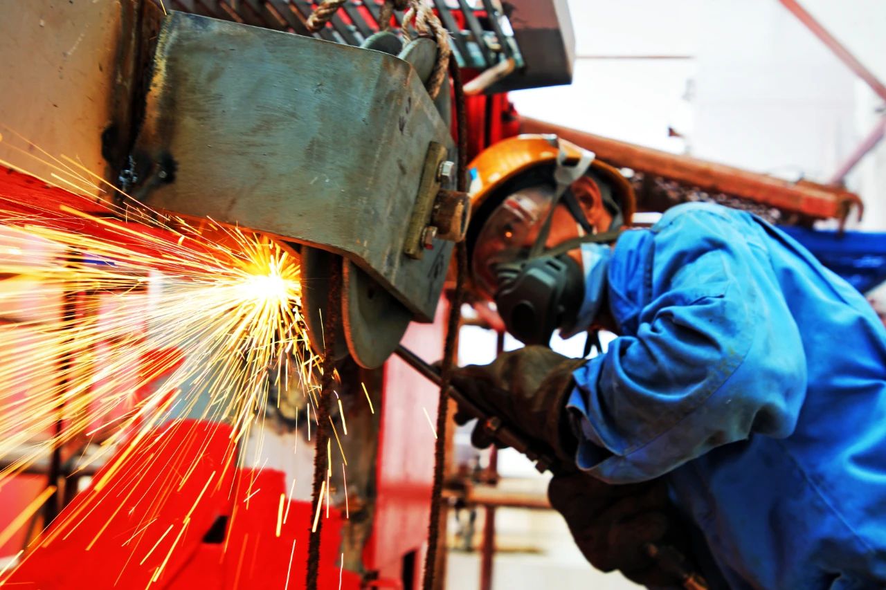 電焊工,就文沖修造最美的一線工人,他們從頭到腳“全副武裝”,一副墨鏡,一個面罩,一套包裹的嚴(yán)嚴(yán)實(shí)實(shí)的工作服是他們的色調(diào)。此起彼伏吱吱作響的燒焊聲,黃紅藍(lán)色的焊花,伴著刺眼的弧光,如噴泉一般是他們奏響的樂章。