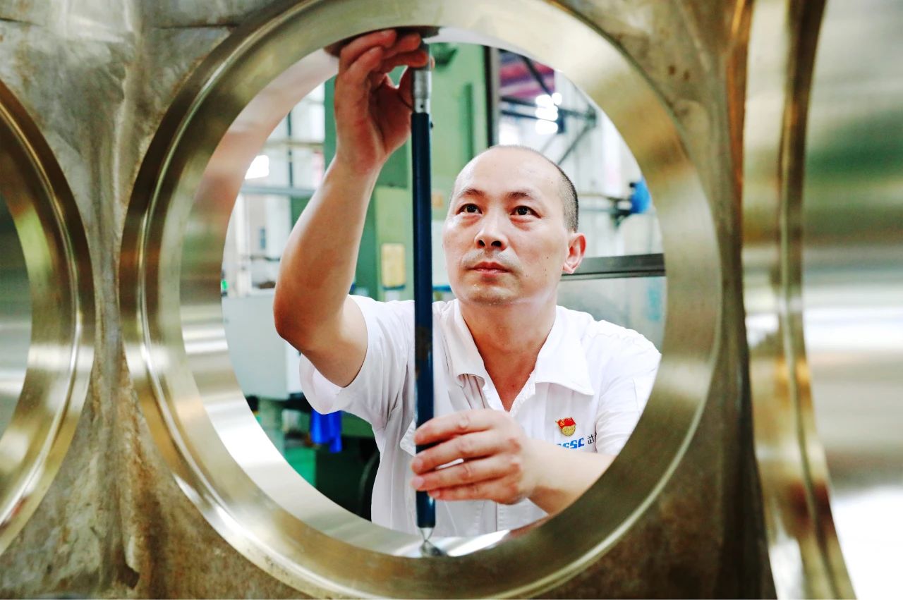 在武漢船機(jī)平臺生產(chǎn)現(xiàn)場,一名機(jī)床操作師傅,正在對加工后的零件進(jìn)行檢測,專注的表情展現(xiàn)了船舶人嚴(yán)把質(zhì)量關(guān),人品以誠心為本,企品以恒心為要,產(chǎn)品以匠心為重的精神風(fēng)貌。