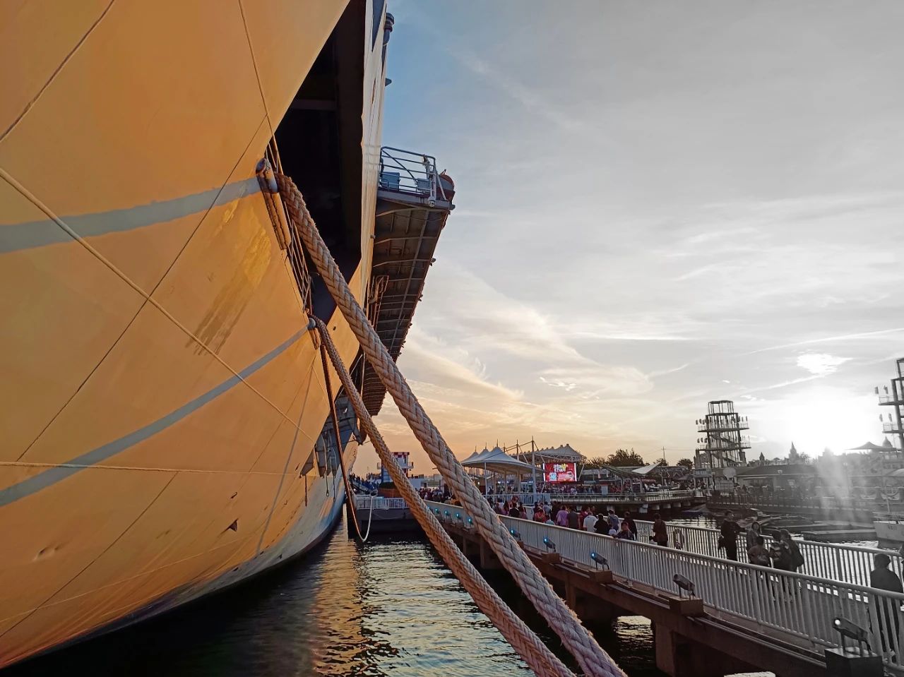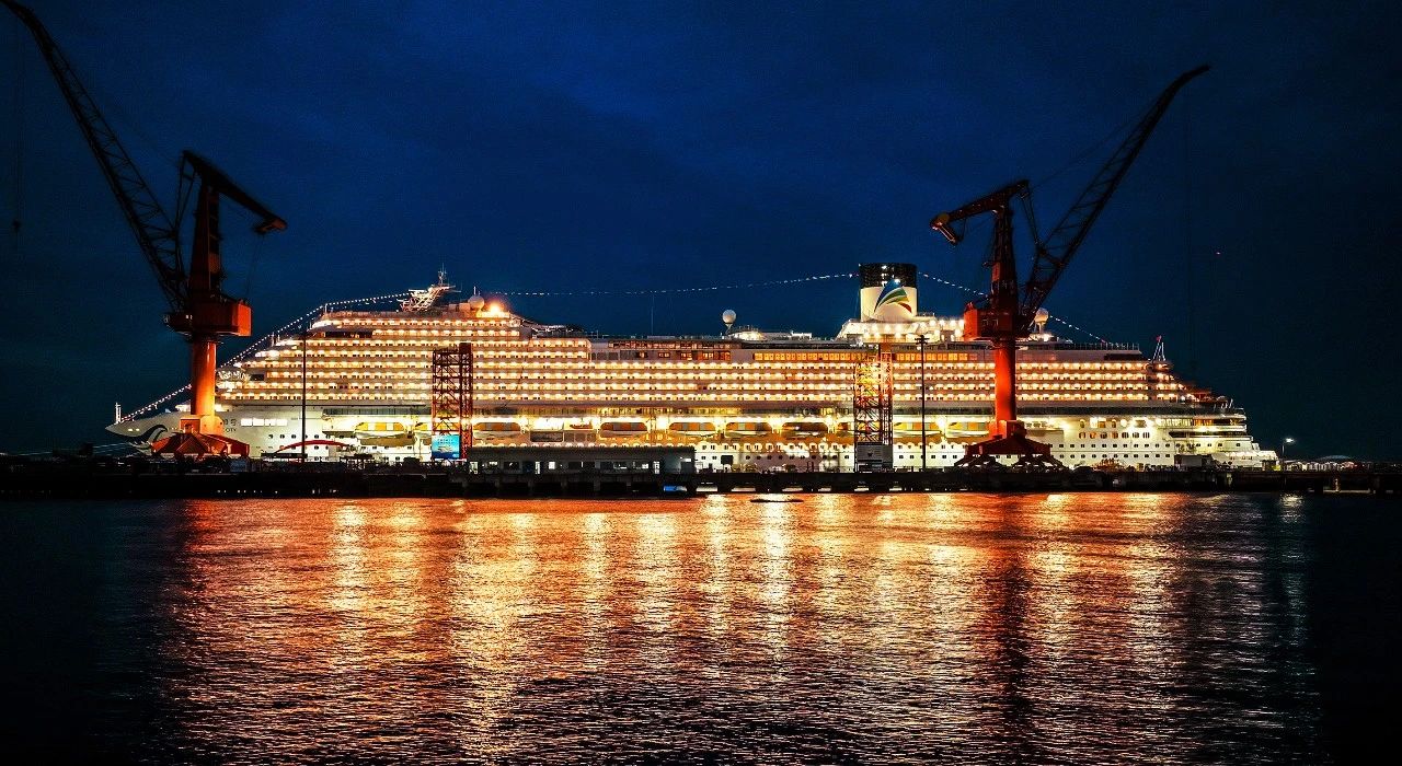 國產(chǎn)首艘國產(chǎn)大型郵輪“愛達·魔都號”,停靠在長江口,燈光電路測試期間,華燈綻放恍如白晝。