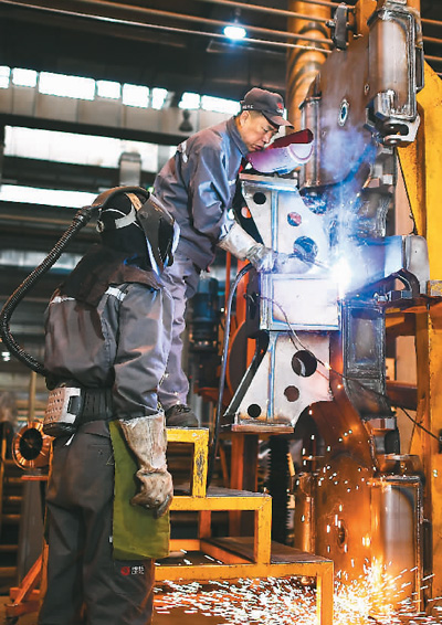 圖為四月二十三日,李萬(wàn)君(右)在為徒弟示范焊接技巧。新華社記者 許 暢攝