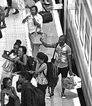 6月9日,乘客到達(dá)內(nèi)羅畢火車站后與火車合影。新華社發(fā)