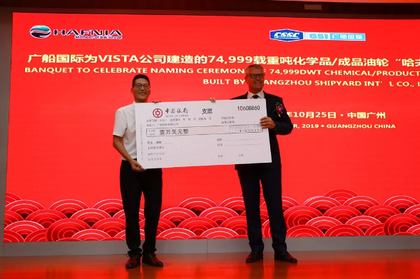 10月25日,廣船國際有限公司為VISTA公司建造的7.5萬噸化學(xué)品/成品油船4號船命名交付。這是廣船國際在“決戰(zhàn)120天,掀起生產(chǎn)高潮”勞動(dòng)競賽中收獲的又一枚勝利果實(shí)。該船比合同交船期提前43天交付,船東為此專門獎(jiǎng)勵(lì)廣船國際1萬美元。