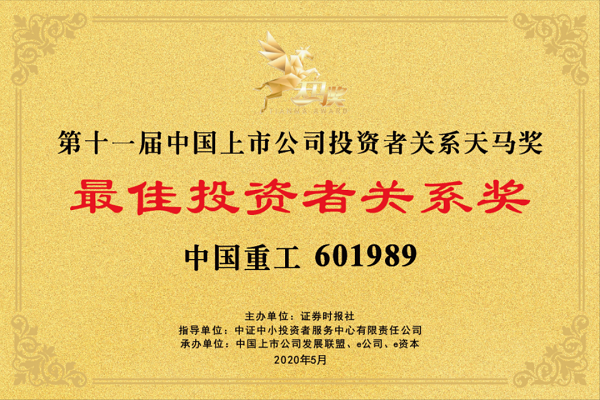 ????本次中國(guó)重工榮獲“最佳投資者關(guān)系獎(jiǎng)”,充分體現(xiàn)出各方對(duì)中國(guó)重工規(guī)范運(yùn)作、公司治理、信息披露、投資者關(guān)系等方面工作的認(rèn)可。中國(guó)重工自上市以來(lái),高度重視投資者關(guān)系,持續(xù)加強(qiáng)規(guī)范運(yùn)作,嚴(yán)格履行信息披露義務(wù),中國(guó)重工信息披露工作已連續(xù)五年獲得A級(jí)評(píng)價(jià)。未來(lái),中國(guó)重工將繼續(xù)努力推動(dòng)各項(xiàng)工作再上新臺(tái)階,不斷提升內(nèi)在價(jià)值。