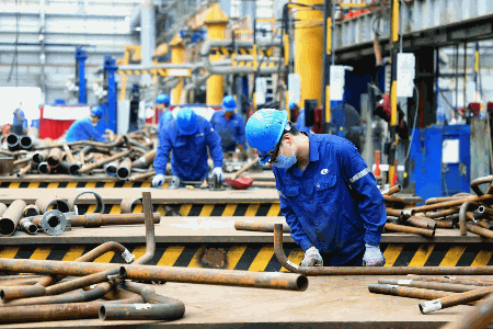 廣船國際首個(gè)吸力筒導(dǎo)管架風(fēng)機(jī)基礎(chǔ)施工現(xiàn)場,技術(shù)工人正在進(jìn)行管子焊接作業(yè)。