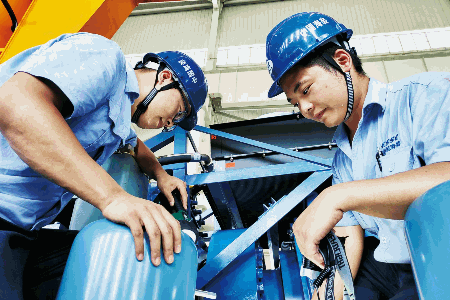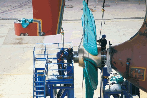 大船集團(tuán)山船重工塢內(nèi)施工現(xiàn)場,鉗工正在進(jìn)行螺旋槳安裝工作,為后續(xù)該船按期出塢打下基礎(chǔ)。