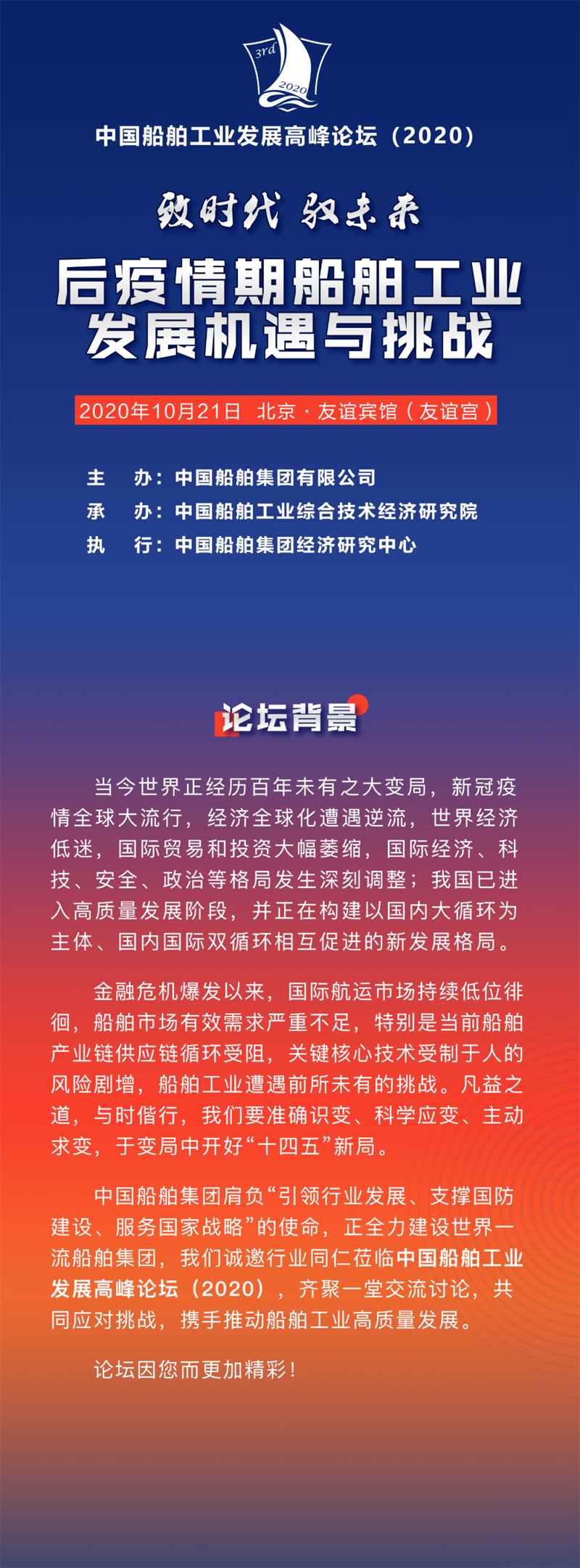 中國船舶集團(tuán)肩負(fù)“引領(lǐng)行業(yè)發(fā)展、支撐國防建設(shè)、服務(wù)國家戰(zhàn)略”的使命,正全力建設(shè)世界一流船舶集團(tuán),我們誠邀行業(yè)同仁蒞臨中國船舶工業(yè)發(fā)展高峰論壇(2020),齊聚一堂交流討論,共同應(yīng)對挑戰(zhàn),攜手推動船舶工業(yè)高質(zhì)量發(fā)展。