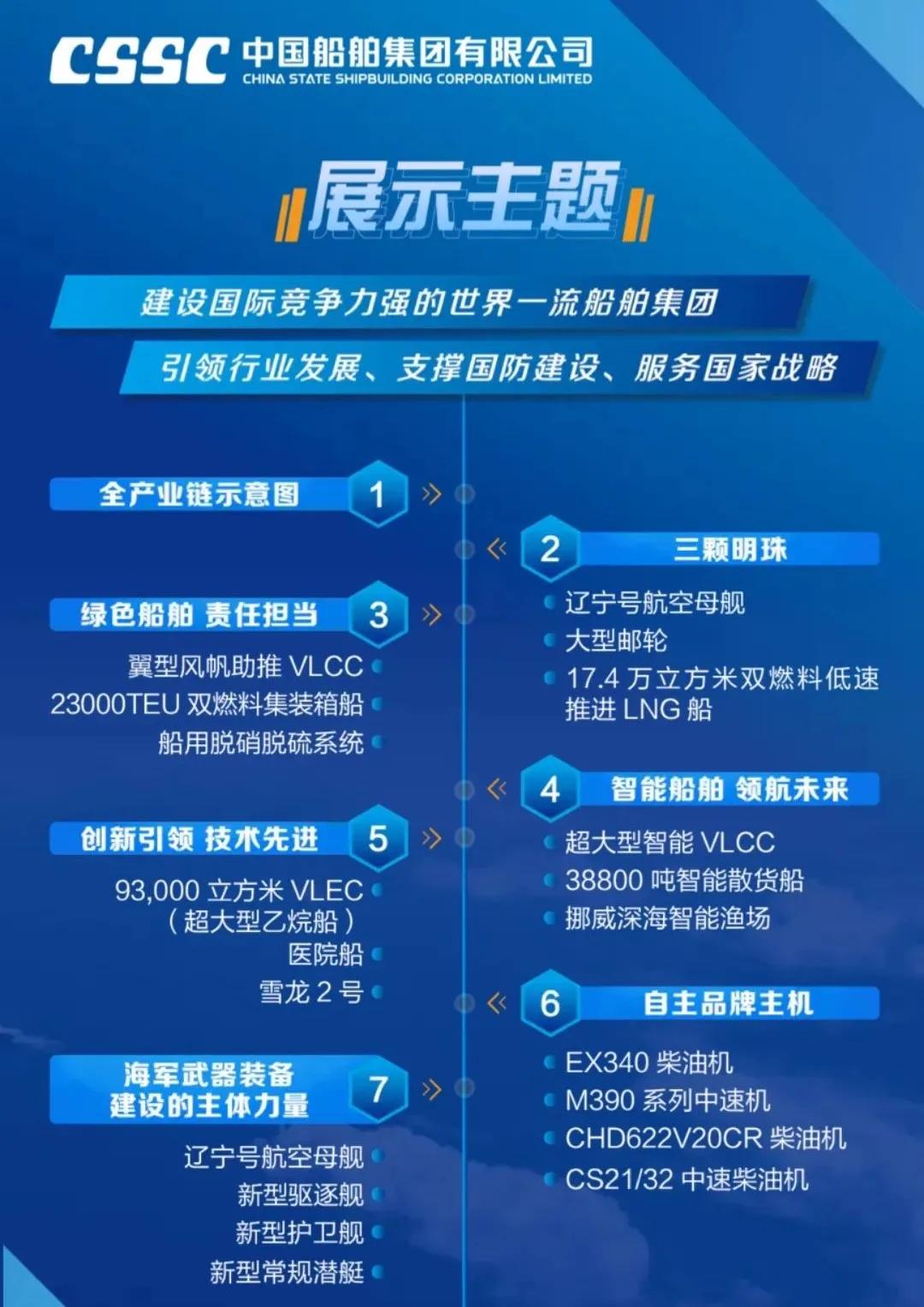 船舶海工裝備產(chǎn)業(yè)展區(qū) 分為船舶與海洋工程、船舶配套2個大區(qū),整體展示了中國船舶集團強大的船舶建造能力。船舶與海洋工程分為海洋運輸與工程裝備,海洋資源開發(fā)、海洋科考裝備,海洋漁業(yè),新開發(fā)船型與船舶改裝等六大板塊;船舶配套區(qū)包括動力與配套、機電裝備和電子信息裝備3大部分,共展出模型及實物68個,重點聚焦自主品牌、系列化產(chǎn)品及國際領先產(chǎn)品,展示了中國船舶集團在業(yè)界最為完整齊全的船舶動力機電配套產(chǎn)業(yè)鏈,具備提供穩(wěn)定、可靠的全動力和配套解決方案的能力。