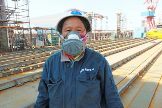 近40度的高溫天氣下,一位造船精度人堅守崗位,使用全站儀監(jiān)控船塢每個搭載總段的定位精度,保障一次搭載到位。