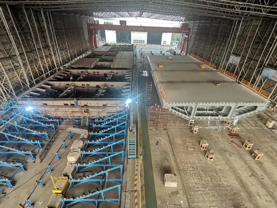 同樣承擔(dān)了深中通道隧道沉管鋼殼制造任務(wù)的中國船舶集團旗下廣船國際,近日剛剛完成了E15管節(jié)鋼殼的過駁交付。E16鋼殼計劃在9月底前進行聯(lián)合驗收;E17鋼殼則正在進行大節(jié)段總組。