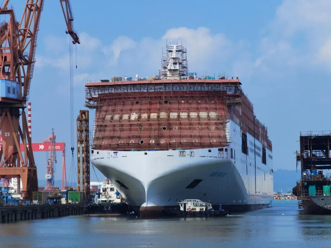 該船實(shí)現(xiàn)了出塢前上建亮燈。電纜拉放完成率87.8%,作為全球最大的豪華客滾船,該船全船電纜長度達(dá)到了946公里(相當(dāng)于從廣州到重慶);出塢前已完成了830公里電纜的拉放工作。涂裝完整性實(shí)現(xiàn)突破,該船出塢時上層建筑上方仍有部分區(qū)域未完成涂裝? 這是因?yàn)樵摯怪备叨纫呀咏?0米,超過了船塢高空車的最大極限。
