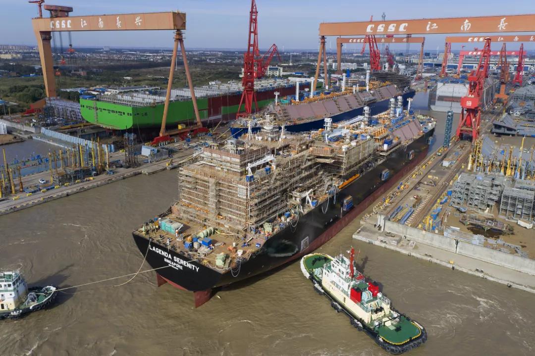 滬東中華全年累計(jì)交船17艘,其中23000TEU雙燃料超大型集裝箱船3艘、174000立方米液化天然氣(LNG)運(yùn)輸船2艘、174000立方米大型浮式液化天然氣儲(chǔ)存及再氣化裝置(LNG-FSRU)2艘、優(yōu)化型13000噸重吊船4艘、18600立方米LNG加注船1艘、15000TEU超大型集裝箱船3艘,以及其他船舶2艘。