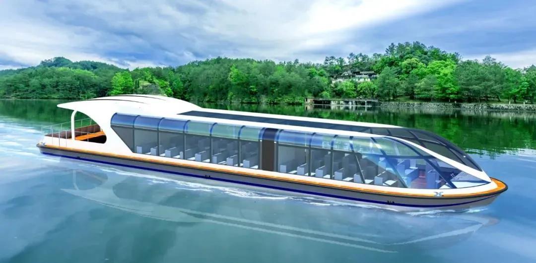 △ 新疆喀納斯新能源游船總長(zhǎng)19.7米,船寬4.5米,型深1.6米,最大航速18km/h,乘客60人。