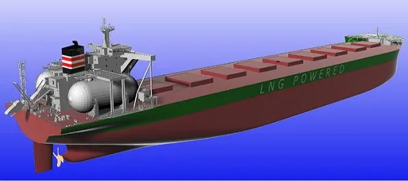 18萬(wàn)噸好望角型雙燃料散貨船由外高橋造船自主設(shè)計(jì),采用LNG燃料和傳統(tǒng)燃料油驅(qū)動(dòng),共配置兩個(gè)C型LNG燃料罐,可一次性滿(mǎn)足完成中國(guó)至澳大利亞航線兩個(gè)來(lái)回或中國(guó)至巴西航線一個(gè)來(lái)回的路程需求。在LNG燃料模式下,該船基本消除顆粒物和硫化物的排放,滿(mǎn)足國(guó)際海事組織IMO第四階段規(guī)范要求,具有綠色、環(huán)保、節(jié)能、安全等顯著特色。