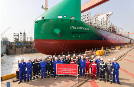 5月15日,中國船舶集團(tuán)旗下滬東中華為法國達(dá)飛集團(tuán)建造的13000TEU雙燃料集裝箱船首制船(H1839A)在順利出塢。該項(xiàng)目共6艘13000TEU雙燃料集裝箱船,目前首制船出塢,2號3號船塢內(nèi)建造,4號船燃料艙即將入塢,5號船處于分段制造階段,6號船于5月4日完成開工。
