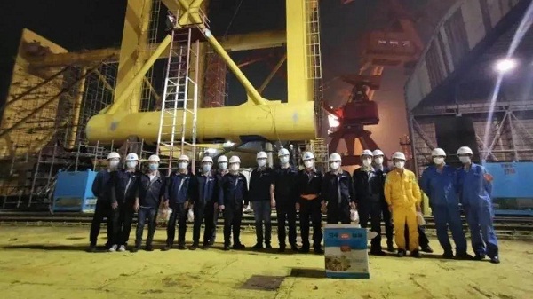 ????同一天,隨著最后一塊防沉平臺箱梁分段順利吊裝,黃埔文沖非船團隊已經(jīng)連續(xù)奮戰(zhàn)十天十夜。至此,為保利長大公司建造的明陽華西單樁穩(wěn)樁平臺主體工程