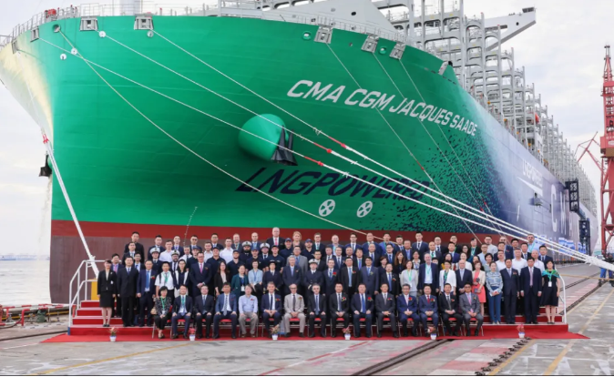 9月22日,由中國(guó)船舶集團(tuán)有限公司旗下滬東中華造船(集團(tuán))有限公司和中國(guó)船舶工業(yè)貿(mào)易有限公司作為聯(lián)合賣方為世界著名航運(yùn)公司——法國(guó)達(dá)飛海運(yùn)集團(tuán)建造的全球首艘23000TEU雙燃料動(dòng)力集裝箱船“達(dá)飛雅克?薩德”號(hào),在上海長(zhǎng)興島造船基地命名交付。中國(guó)船舶集團(tuán)副總經(jīng)理孫偉、達(dá)飛海運(yùn)集團(tuán)董事會(huì)主席魯?shù)婪颉に_德出席儀式并致辭,教母譚雅·薩德為新船命名,法國(guó)駐滬總領(lǐng)事紀(jì)博偉應(yīng)邀出席儀式。