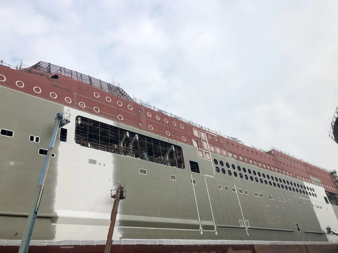 該船實(shí)現(xiàn)了出塢前上建亮燈。電纜拉放完成率87.8%,作為全球最大的豪華客滾船,該船全船電纜長(zhǎng)度達(dá)到了946公里(相當(dāng)于從廣州到重慶);出塢前已完成了830公里電纜的拉放工作。涂裝完整性實(shí)現(xiàn)突破,該船出塢時(shí)上層建筑上方仍有部分區(qū)域未完成涂裝? 這是因?yàn)樵摯怪备叨纫呀咏?0米,超過(guò)了船塢高空車的最大極限。