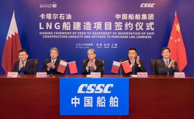 4月22日,中國(guó)船舶集團(tuán)與卡塔爾石油公司簽署“中國(guó)船舶—卡塔爾石油液化天然氣(LNG)船建造項(xiàng)目”協(xié)議,所涉訂單總金額超過(guò)200億元人民幣。