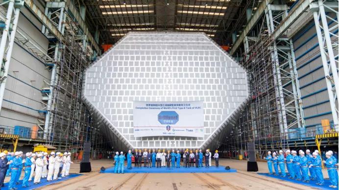 VLEC建造團隊在船東、配套廠商和船級社等各方密切配合下,共同克服新冠肺炎疫情等不利因素,攻克B型液貨艙核心關(guān)鍵技術(shù)難點,注重項目管理導(dǎo)向、革新工藝工法、鎳鋼焊接程序、薄板變形控制和優(yōu)化建造流程。從2019年12月底合同簽約到今天首制船的完工交付,總建造周期24個月,碼頭舾裝周期4個月,均開創(chuàng)了江南造船大型液化氣船首制船最短周期紀錄,實現(xiàn)了復(fù)雜船型節(jié)拍化建造。