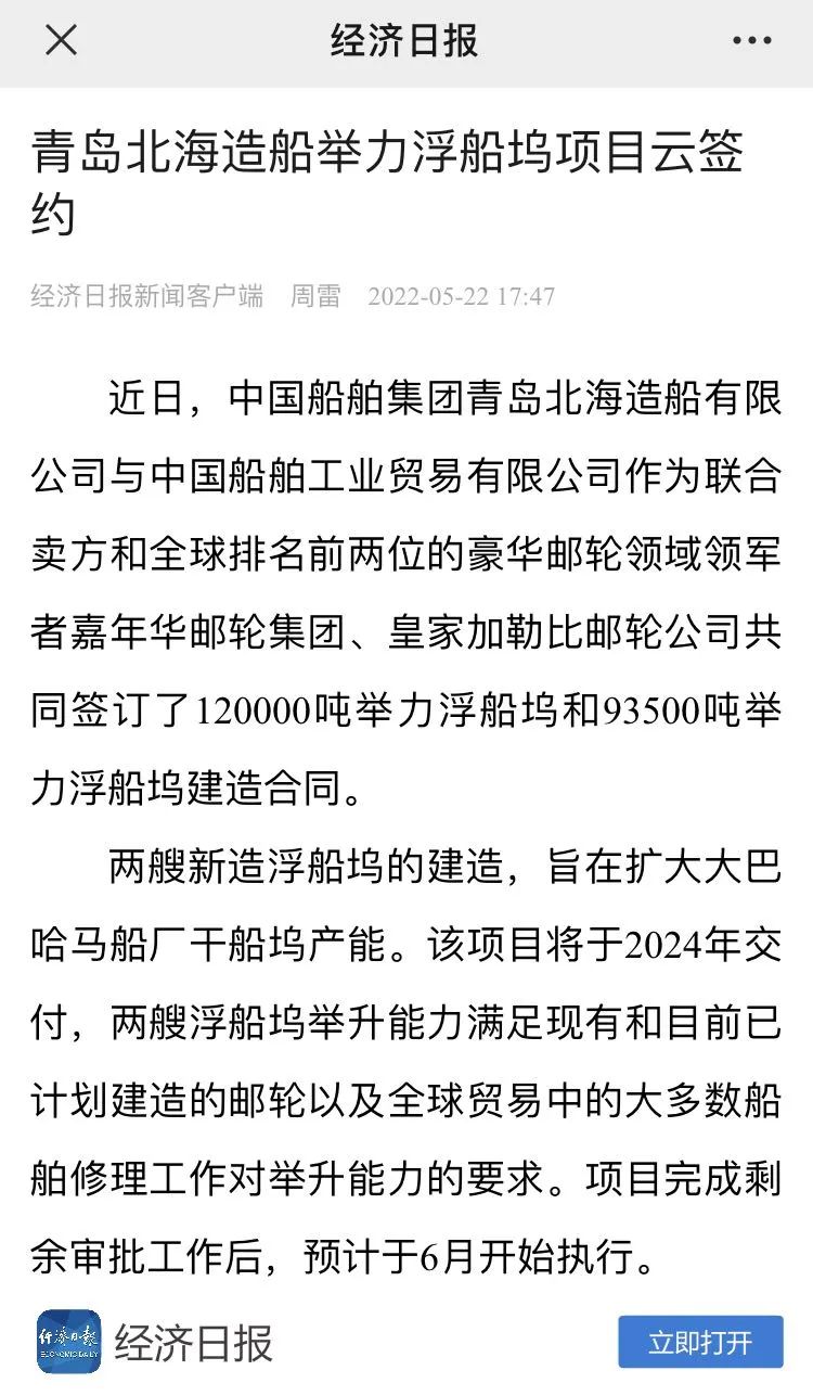 日前,中國(guó)船舶集團(tuán)旗下北海造船與中船貿(mào)易作為聯(lián)合賣方,與嘉年華郵輪集團(tuán)、皇家加勒比郵輪公司共同簽訂了1艘12萬(wàn)噸舉力浮船塢和1艘9.35萬(wàn)噸舉力浮船塢建造合同。中國(guó)船舶集團(tuán)黨組書(shū)記、董事長(zhǎng)雷凡培,黨組成員、副總經(jīng)理孫偉,嘉年華集團(tuán)總裁兼首席執(zhí)行官阿諾德·唐納德,皇家加勒比集團(tuán)總裁兼首席執(zhí)行官杰森·利伯特共同見(jiàn)證此次“云”簽約。