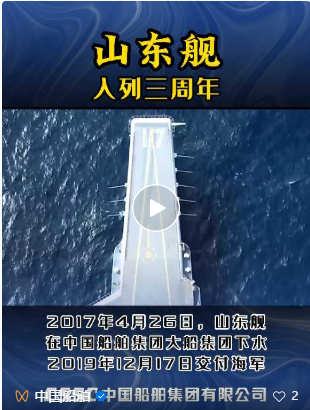 山東艦是我國第二艘航空母艦,也是我國自主設(shè)計、自主配套、自主建造的首艘航母。2017年4月26日,山東艦在素有“海軍艦艇搖籃”美譽的中國船舶集團旗下大船集團碼頭下水,自此揭開了中國雙航母時代篇章。