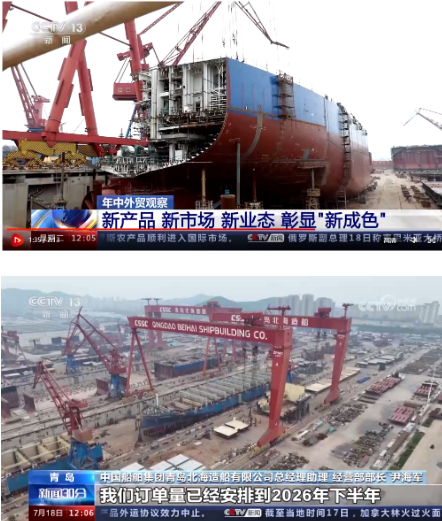 7月18日,央視《新聞30分》年中外貿(mào)觀察鏡頭再次對準(zhǔn)火熱的造船市場,在出口面臨較大外需壓力的背景下,上半年,中國外貿(mào)頂住了壓力、穩(wěn)住了規(guī)模、提升了質(zhì)量,既呈現(xiàn)出“韌性”底色,又展現(xiàn)了多種“新”的成色。