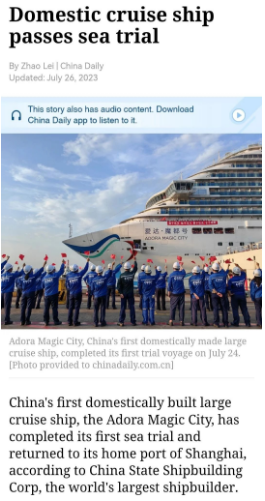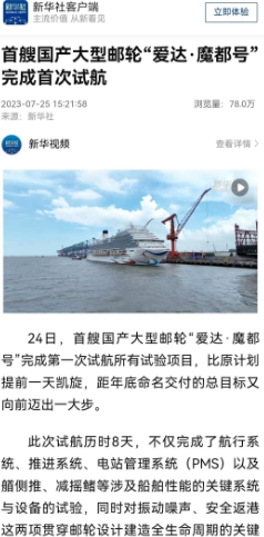 7月24日晚,首艘國產(chǎn)大型郵輪“愛達(dá)·魔都號(hào)”完成第一次試航所有試驗(yàn)項(xiàng)目比原計(jì)劃提前一天凱旋,人民日?qǐng)?bào)、新華社、中央電視臺(tái)等中央主流媒體進(jìn)行了報(bào)道。