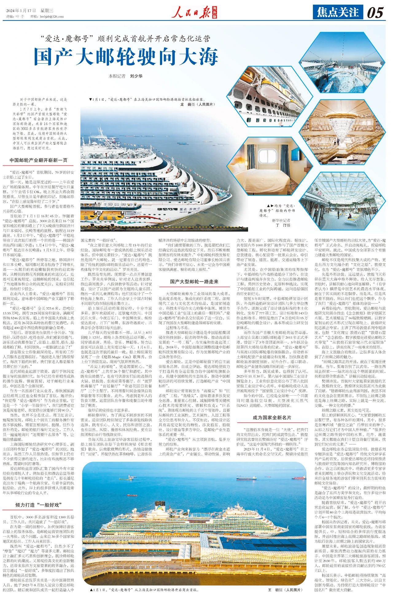 1月17日,人民日報海外版第五版焦點關(guān)注刊發(fā)整版文章,聚焦“愛達·魔都號”。