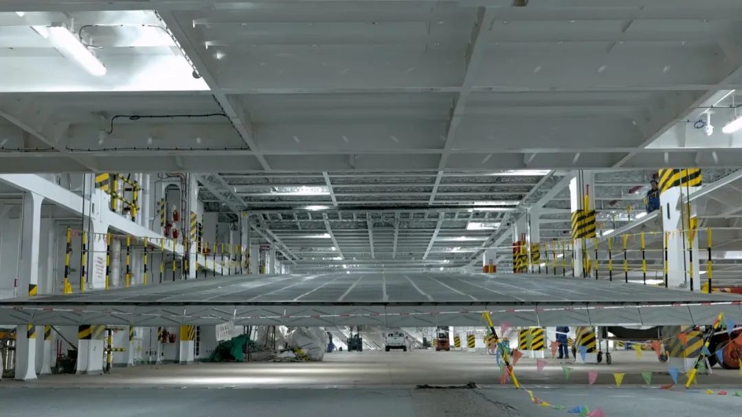 中國船舶廣船國際建造在近年來,致力研發(fā)、攻堅克難,2024年成功完工交付了12艘雙燃料汽車運(yùn)輸船。這種大型滾輪船總長約200米,型寬38米,擁有12層甲板, 能裝載7000輛汽車,體型可以稱得上是“海上霸王”。但它的特點(diǎn)可不僅僅是能“裝”,還有適配運(yùn)輸新能源汽車的獨(dú)特巧思。